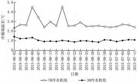 廣場空調(diào)機房擁有12臺某品牌集中空調(diào)冷水機組,其中3#離心式冷水機組制冷量為2110kW,輸入功率為400kW,安裝了冷水機組同品牌端蓋式膠球清洗裝置,其控制系統(tǒng)與冷水機組互聯(lián)互通,根據(jù)冷凝端溫差控制膠球清洗使得二者在其佳效率點附近運行。7#離心式冷水機組制冷量為4218kW,輸入功率為738kW,2臺冷水機組共用冷卻水源,冷凝器換熱管均進行了捅炮清洗。圖7顯示了3#和7#冷水機組冷凝端溫差。從圖7可以看出:未安裝膠球清洗裝置的7#機組2015年6—7月的冷凝端平均溫差為2.80℃,而安裝了冷水機組同品牌膠球清洗裝置的3#機組冷凝端平均溫差為1.05℃,3#機組比7#機組單位制冷量的能耗降低了6.8%,表明同品牌膠球清洗裝置是保證冷水機組始終處于高效運行的關(guān)鍵設(shè)備。