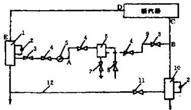 注:1——收球網(wǎng)(△Ps),2——差壓測量裝置,3——閘閥,4—球閥,5——膠球泵,6——裝球室,7-—放水門,8——故氣門,9——膠球管路(△P?),10——二次濾網(wǎng),11--排污蝶閥,12——--排污管路