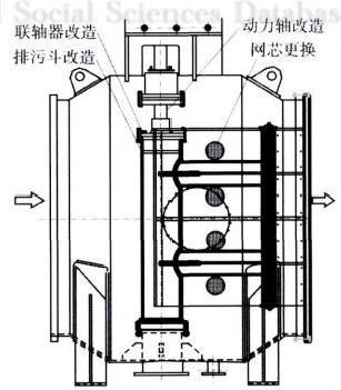 (1)排污斗改造。拆除原有的排污斗上部與動力軸連接的聯(lián)軸器及其短軸,將原短軸連接位置的排污斗上端加長約200mm,并在加長段上部焊接改造后的聯(lián)軸器代替,增強其受剪切應力。