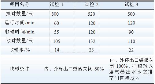 為驗證凝汽器內部結構對收球率的影響進行了3次試驗,試驗數據見表2試驗3。